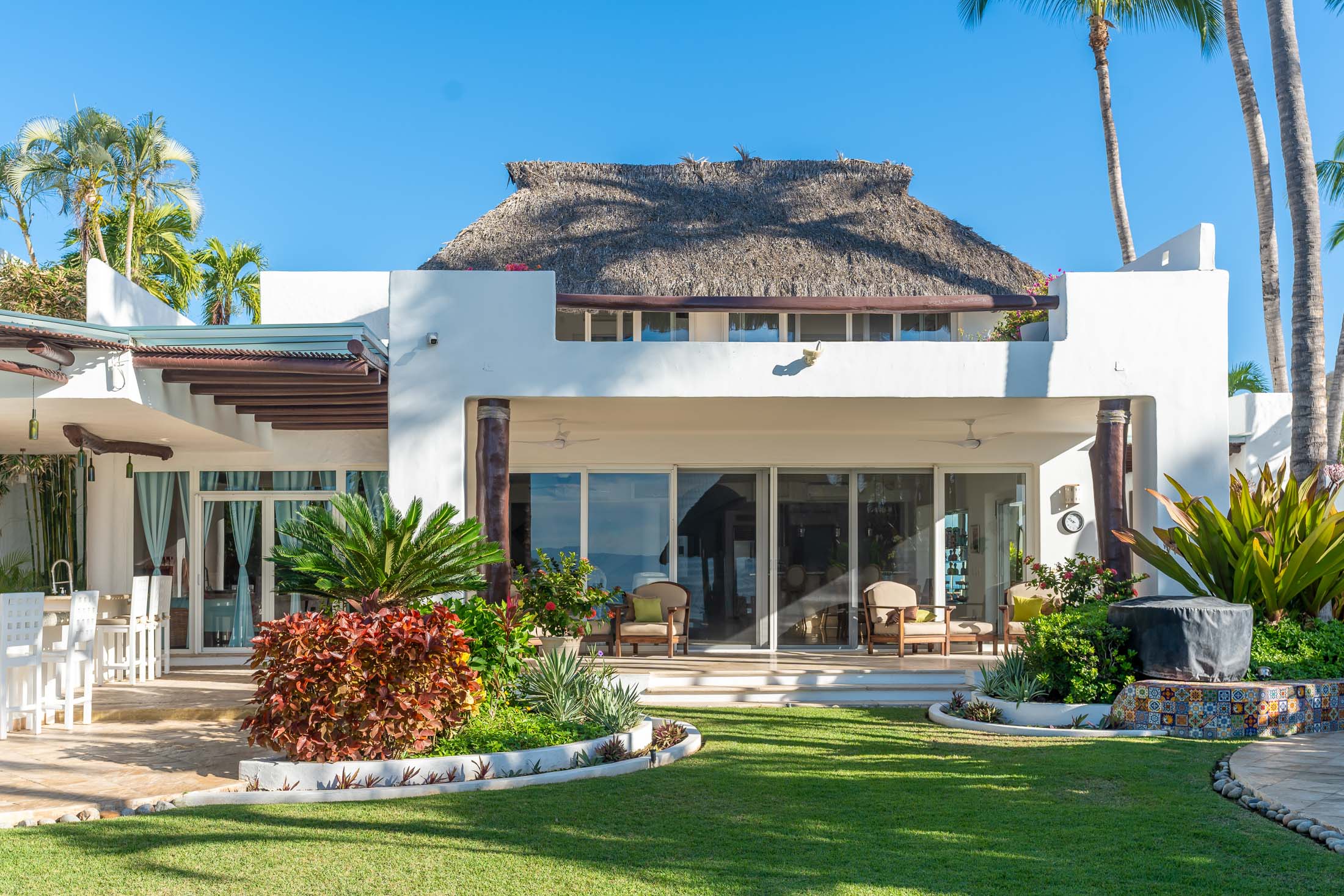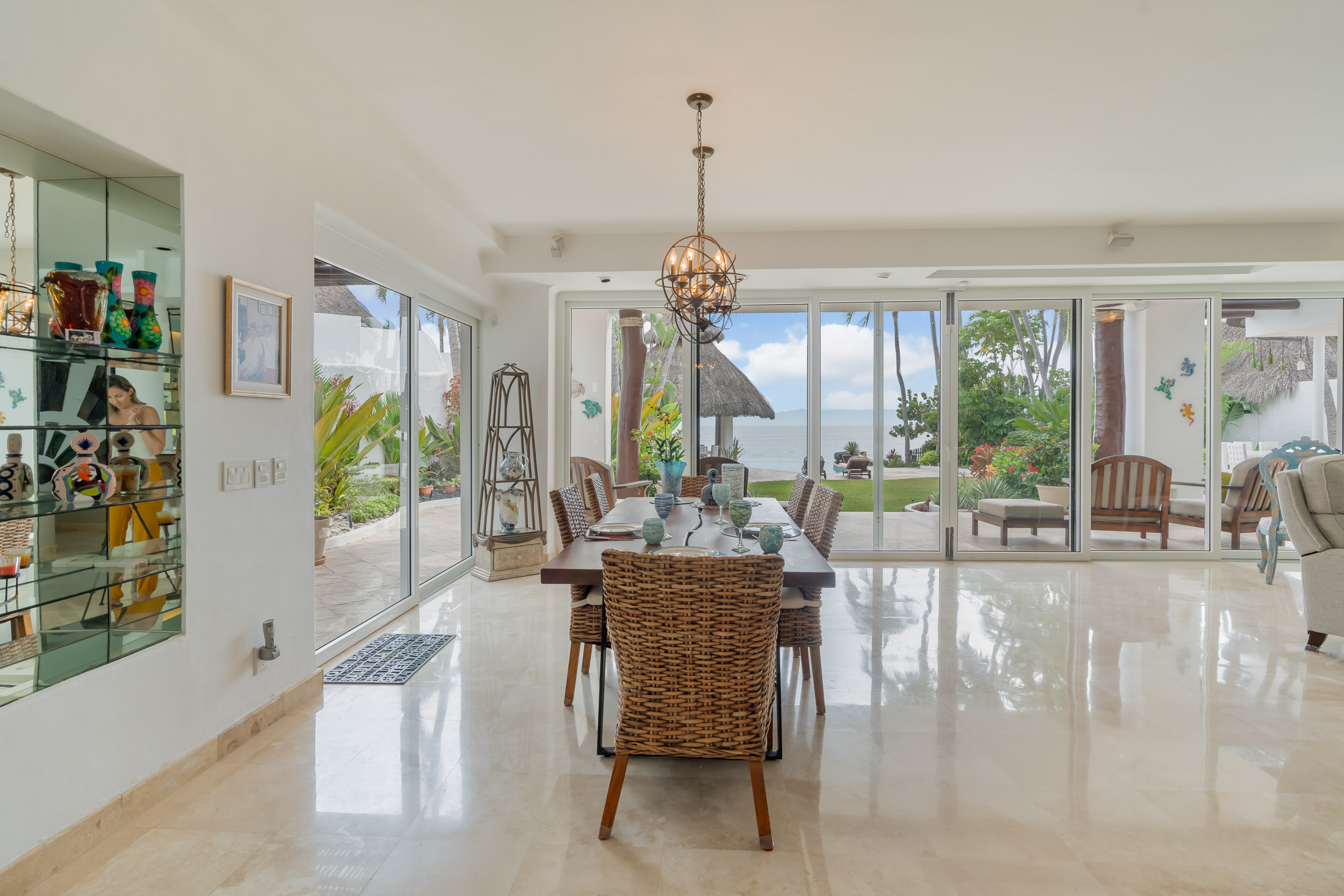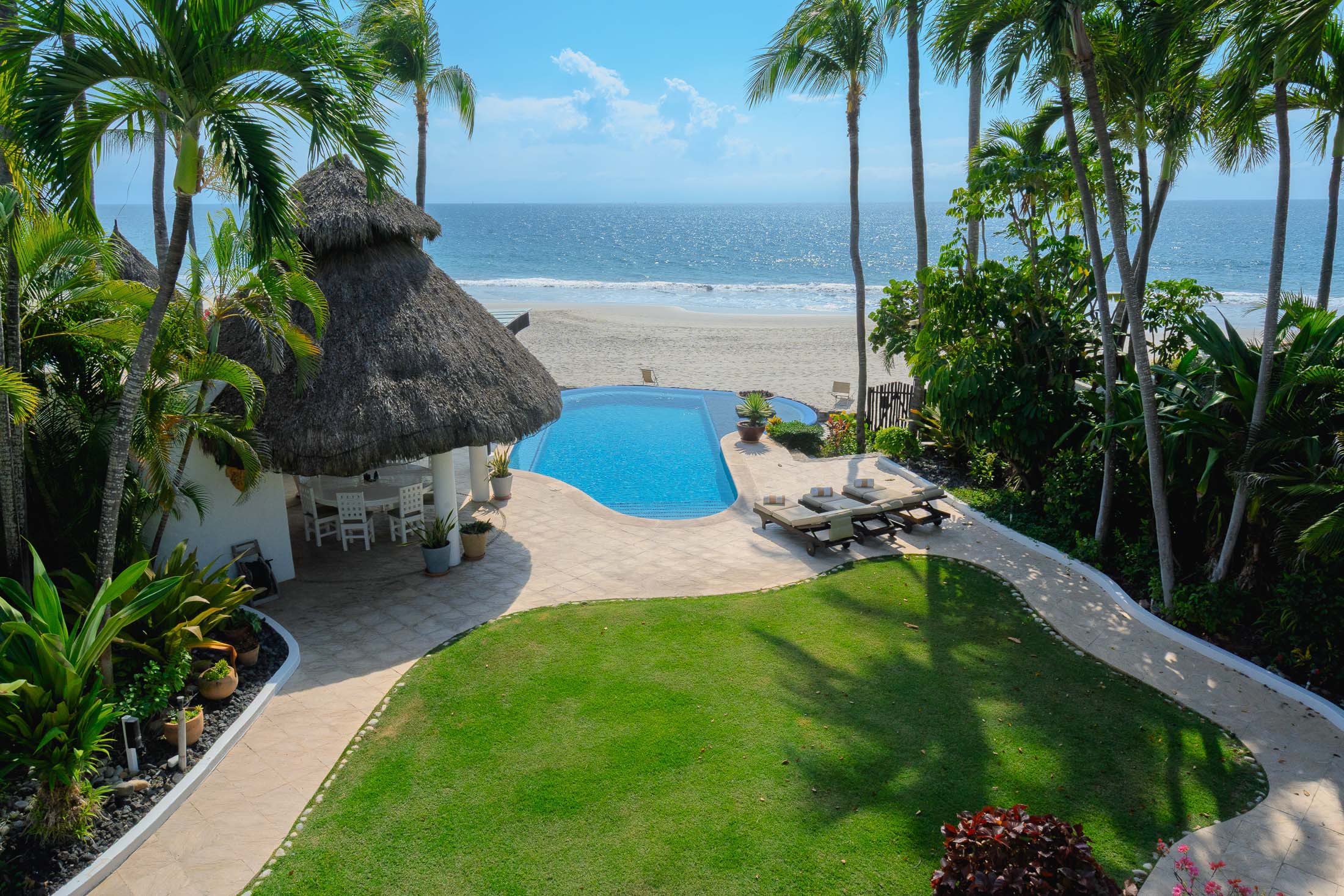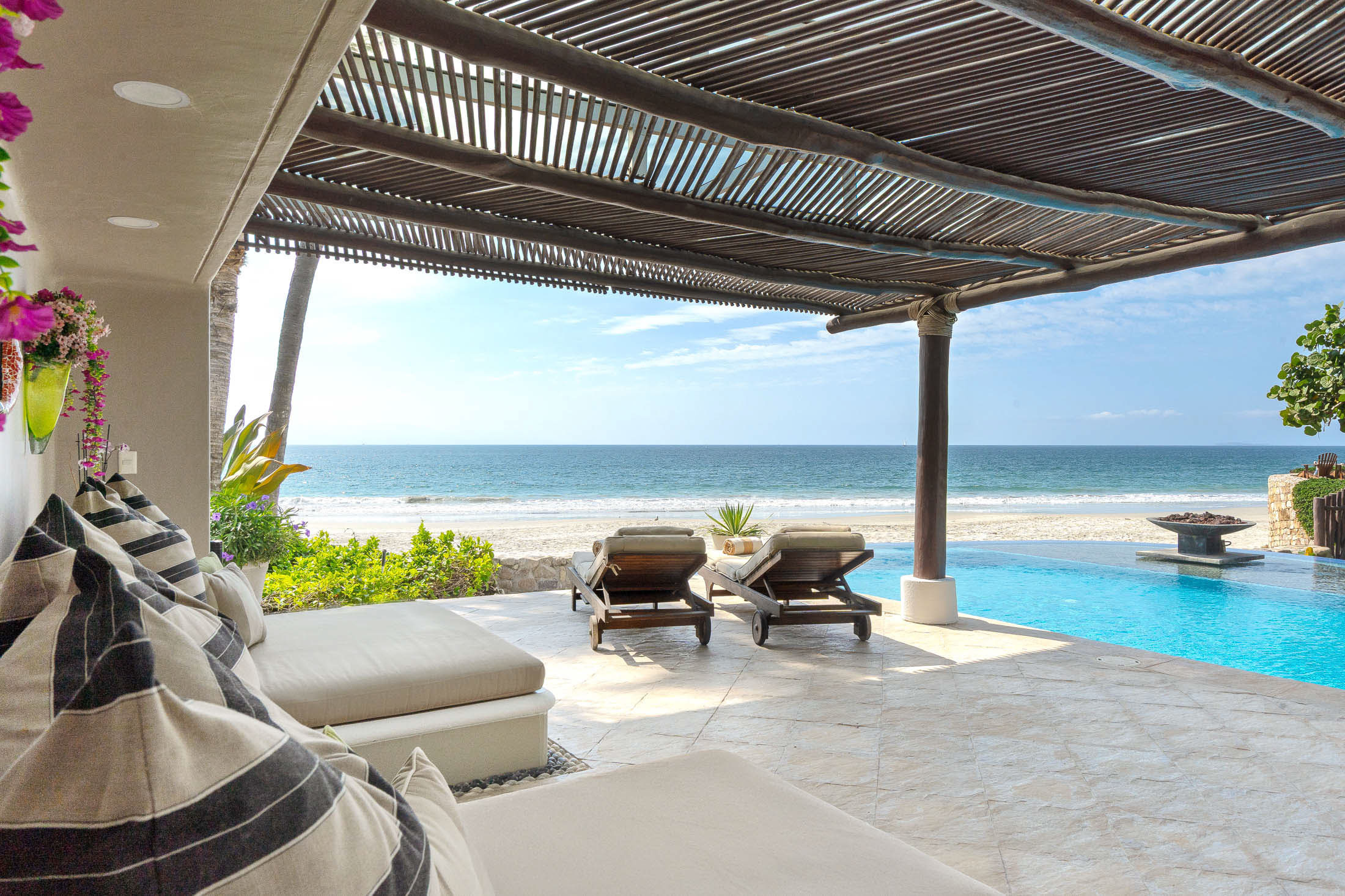 This spacious home features an open floor plan with great room living, dining and kitchen all overlooking a wall of retractable glass doors that lead out to a private, outdoor oceanfront oasis. Exterior entertaining area is complete with a 10-person covered palapa dining, pool cabana with shower, separate outdoor bar and barbeque area overlooking the tiled infinity pool. Views extend outward over the fine sandy beach, and iridescent blue ocean, all framed by the Sierra Madre mountains across the bay including a view to the Las Marieteas Islands.