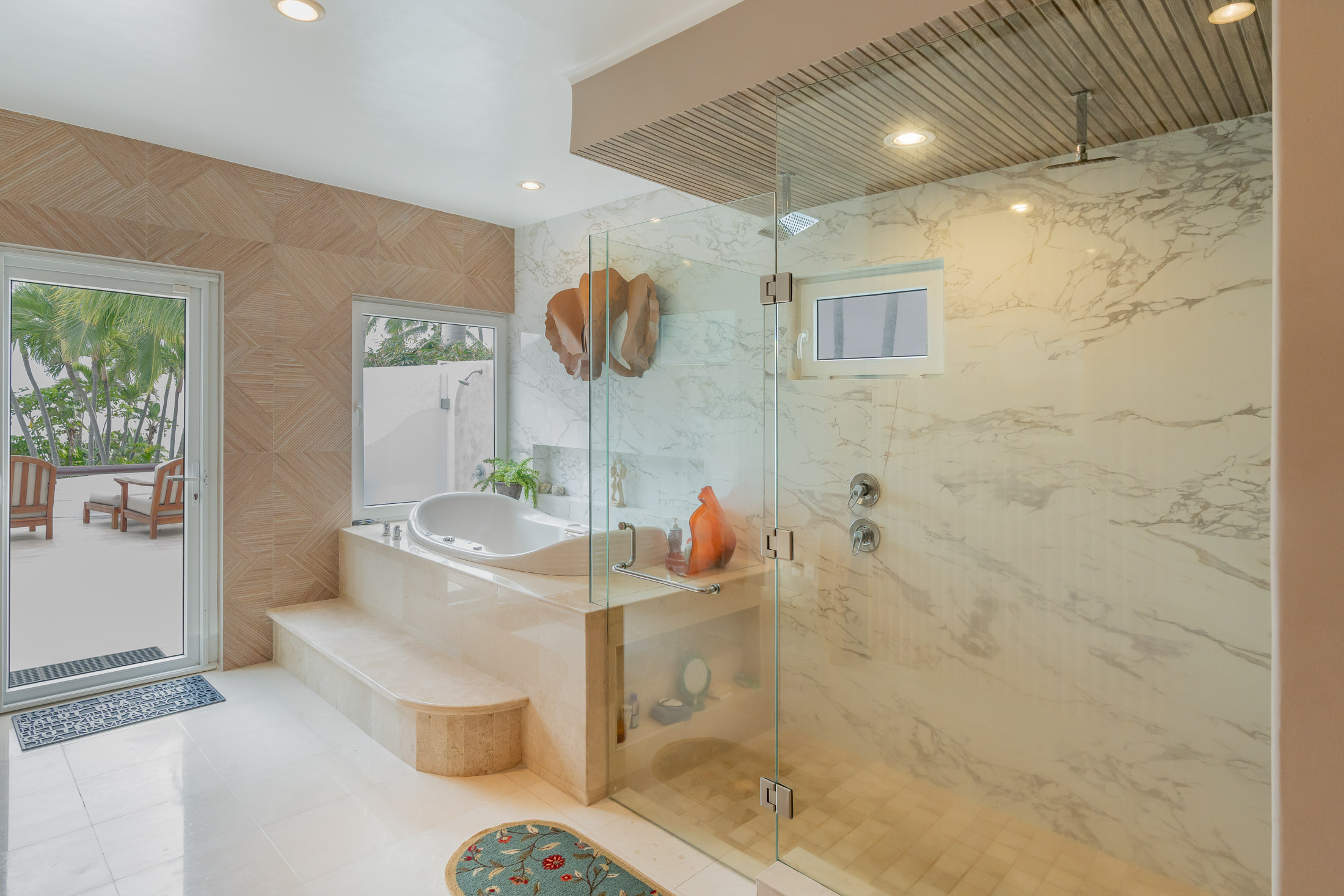• BEDROOM #2: Spacious Guest Suite & Private Covered Courtyard, indoor & outdoor shower, tiled benches, tropical flower planter