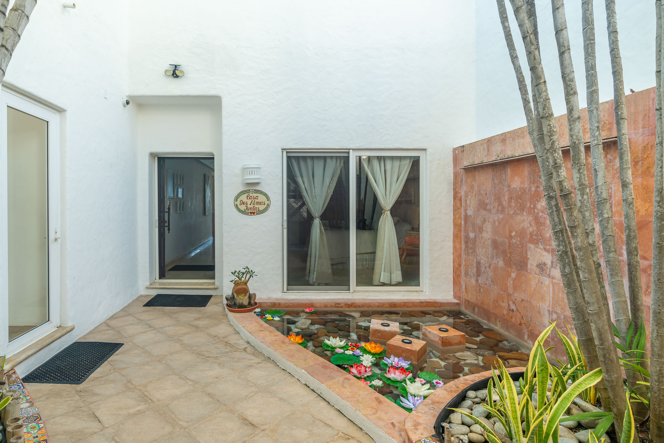 • FRONT ENTRY COURTYARD: Fountain & Lily Pond, custom tiled curbing
